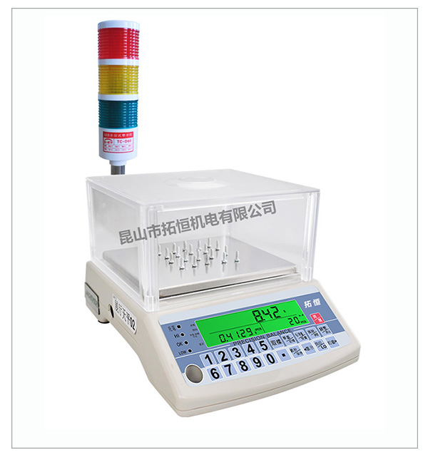 由拓恒公司提供的TH7370系列報警電子天平對貨品進行稱重判別;系統根據設定的上下限值,自動判別出貨品的重量是否合格、包裝箱內貨品的數量或配件是否漏裝或多裝;如果貨品超出或低于設定范圍,系統自動聲光報警(超限紅燈亮,低限黃燈亮,OK綠燈亮);具有準確度高,稱量迅速,工作穩定可靠,維護簡單等特點;